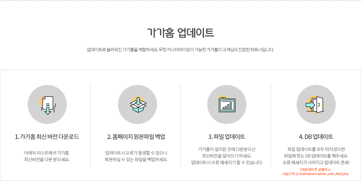 1. ¸ðµç µðÀÚÀΰú ±â´ÉÀÌ °¡°¡¸ô ±âº»µðÀÚÀΰú ±â´ÉÀ¸·Î Ãʱâȵ˴ϴÙ. 2. ¾÷µ¥ÀÌÆ®½Ã ¹®Á¦°¡ ¹ß»ýÇÒ ¼ö ÀÖÀ¸´Ï ¹é¾÷À» ÇϽŠÈÄ ¾÷µ¥ÀÌÆ®¸¦ Çϼ¼¿ä. 3. À¥È£½ºÆÃ ȯ°æÀ» È®ÀÎÇϼ¼¿ä. (PHP5, MYSQL5) 4. ¾÷µ¥ÀÌÆ®½Ã ȯ°æ¼³Á¤ÆÄÀÏ(/mall/config_basic.php)Àº Á¦¿ÜÇÏ½Ã°í ¾÷µ¥ÀÌÆ® Çϼ¼¿ä. ±×³É µ¤¾î¾²±â ÇϽøé ȯ°æ¼³Á¤µµ ÃʱâÈ µË´Ï´Ù. 5. °¡°¡¸ô2.0¹öÀü¿¡¼ °¡°¡¸ô2.1 ¹öÀüÀ¸·Î ¾÷µ¥ÀÌÆ®ÇÏ½Ç °æ¿ì FAQ (Ŭ¸¯) ¿¡¼ 5¹ø,6¹ø °Ô½Ã¹°À» ÇÊÈ÷ Âü°íÇÏ¼Å¾ß ÇÕ´Ï´Ù. °¡°¡È¨ºô´õ ¾÷µ¥ÀÌÆ®´Â Àüü ¾÷µ¥ÀÌÆ®¸¦ ±ÇÀåÇÕ´Ï´Ù. ºÎºÐ ÆÐÄ¡¸¦ ÇÏ½Ç °æ¿ì ¿À·ù°¡ ¹ß»ýÇÒ ¼ö ÀÖÀ¸´Ï ÁÖÀÇÇÏ½Ã°í ºÎºÐ ÆÐÄ¡´Â º°µµ·Î ÀÇ·ÚÇÏ½Ç ¼ö ÀÖ½À´Ï´Ù. |